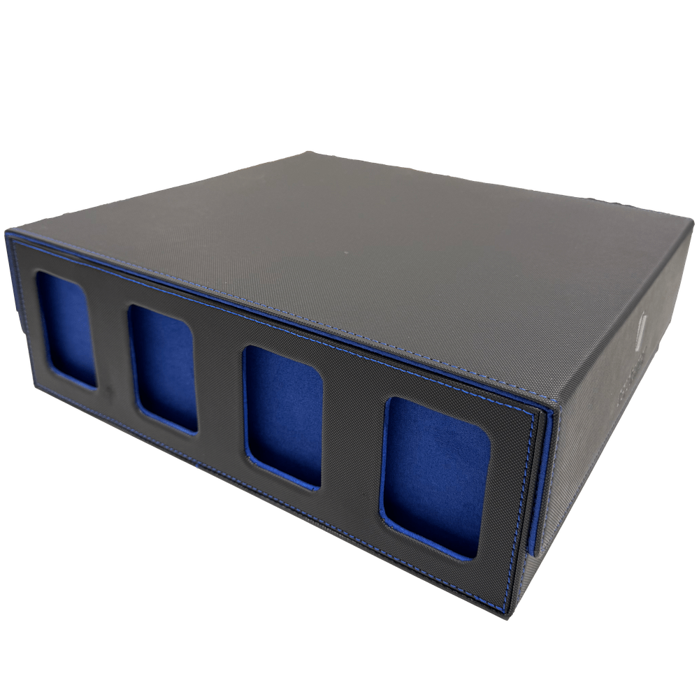 Du får også inkludert 24 fargede card dividers for enkel organisering og fire plast-holdere som hindrer kortene i å velte. Den unike svarte og blå fargekombinasjonen gir et moderne og eksklusivt preg som passer både hjemme og på arrangementer.