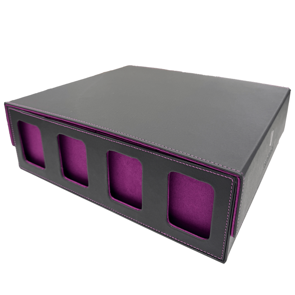 Du får også inkludert 24 fargede card dividers for enkel organisering og fire plast-holdere som hindrer kortene i å velte. Den unike svarte og lilla fargekombinasjonen gir et moderne og eksklusivt preg som passer både hjemme og på arrangementer.
