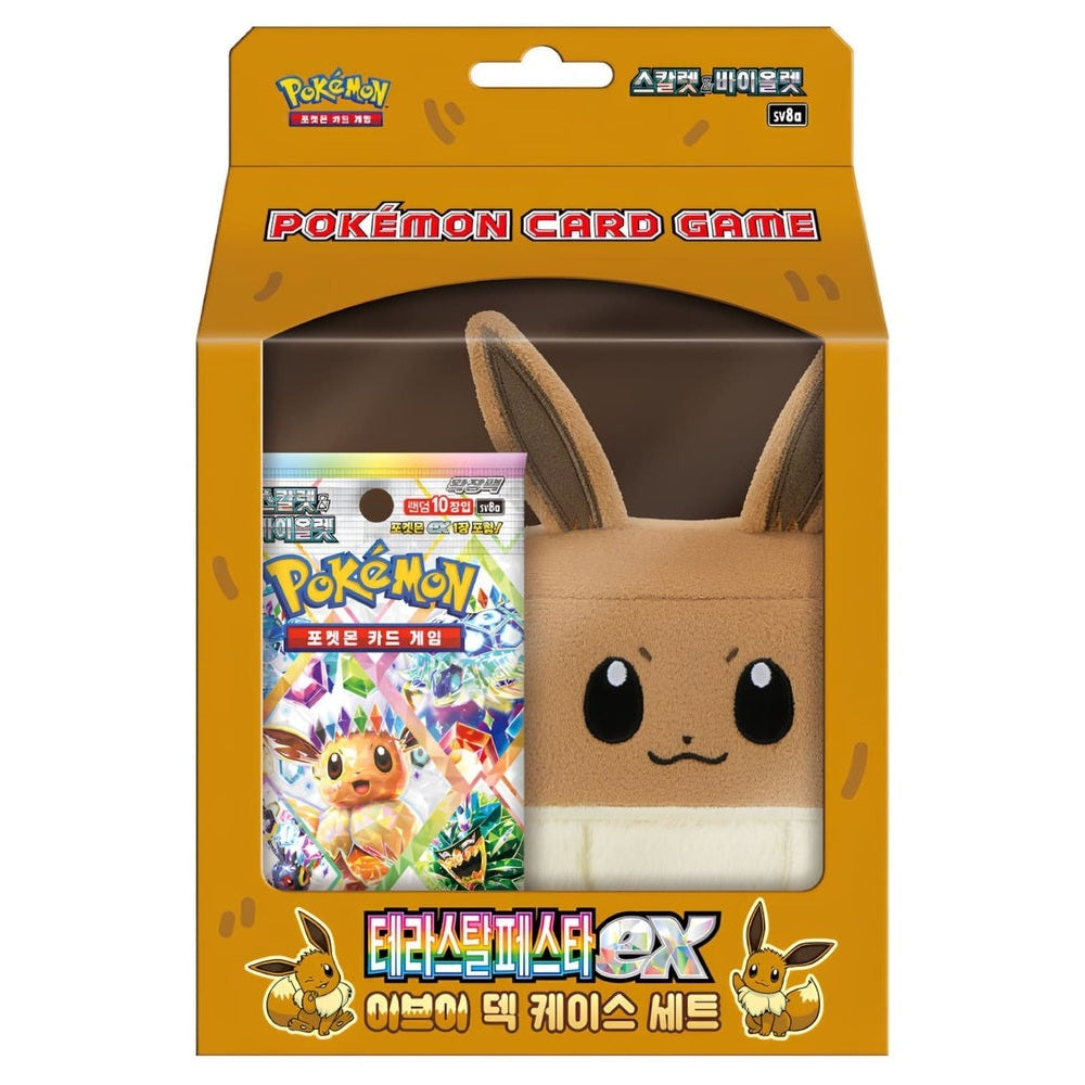 Hovedattraksjonen er en kjempe søt og fluffy Eevee Deck Box, laget i mykt materiale og designet for både oppbevaring og utstilling. Sammen med dette følger koreanske Terastal Festival boosterpakker, et populært sett kjent for flotte illustrasjoner og høy samlerappell.
